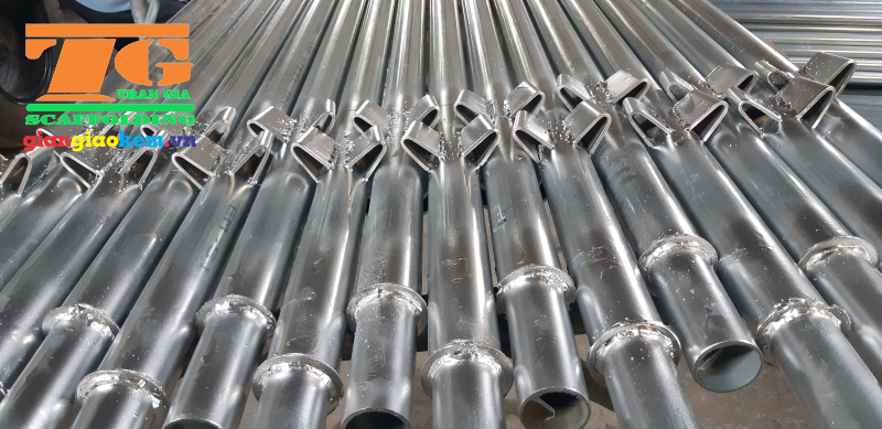 - Giàn giáo nêm dùng cây chống đứng liên kết qua thanh giằng để tăng khả năng chịu lực cao hơn nhiều lần.